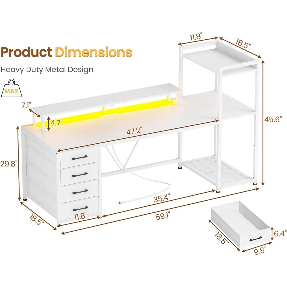 59″ Computer Desk with 4 Drawers and Shelves, Gaming Desk with LED Lights & Power Outlets, Home Office Desk with Large Storage