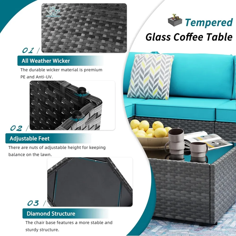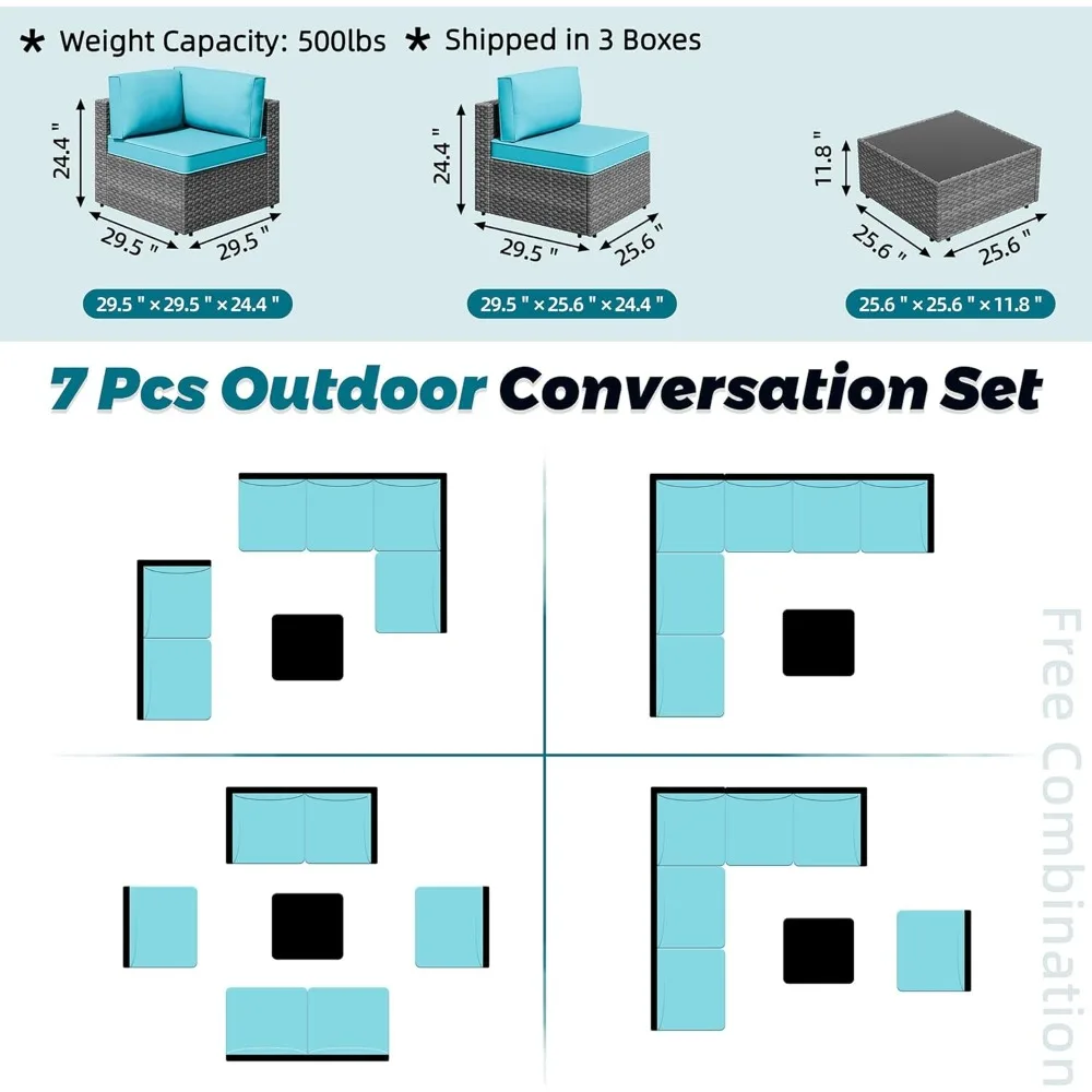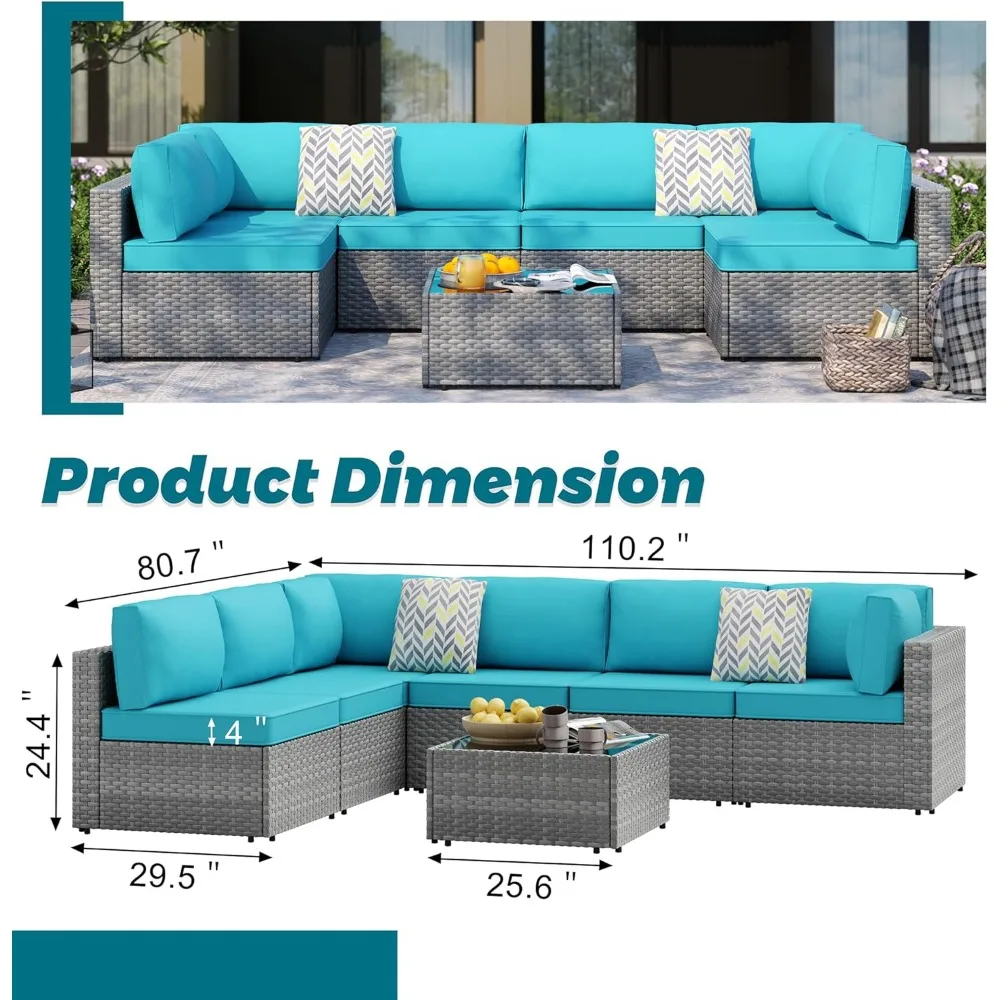 - [Easy to assemble] All parts is easy to assemble with clear instructions and all necessary accessories included. What you get: 7-piece patio conversation set contains: 2*Conner Sofas: 29.5 x 29.5 x 24.8 inches, 4*Armless Sofas: 29.5 x 25.6 x 24.8 inches, 1*Coffee Table: 25.6 x 25.6 x 14 inches.