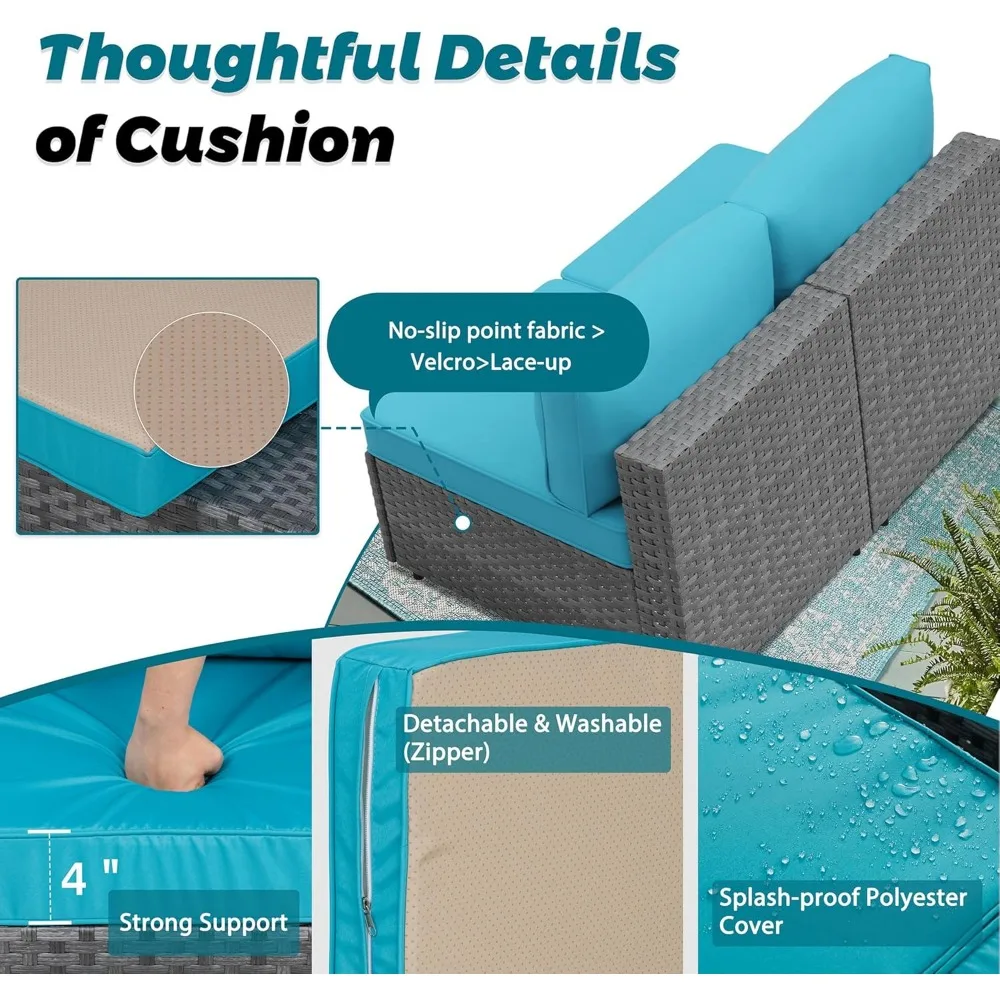 - [Heavy-Duty Structure] Our patio furniture set is made of premium wicker and fade-resistant cushions, and a heavy-duty steel frame with able to hold 5-6 people. it’s 4 inches high padded seat cushion could increase the force area and release the comfort of the lumbar region. A patio sofa with a great seating experience can unlock more possibilities in a limited space.