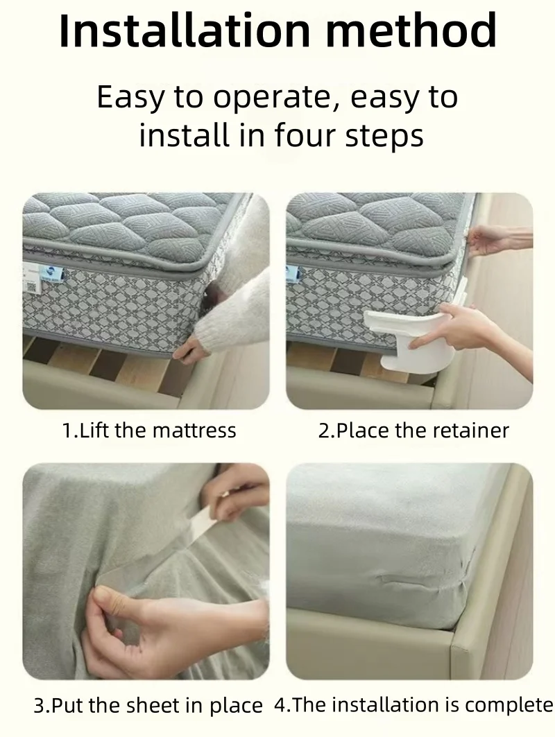 1.This bed sheet set retainer is specifically engineered to enhance home cleanliness,featuring a non-slip design that securely fastens the sheets in place.