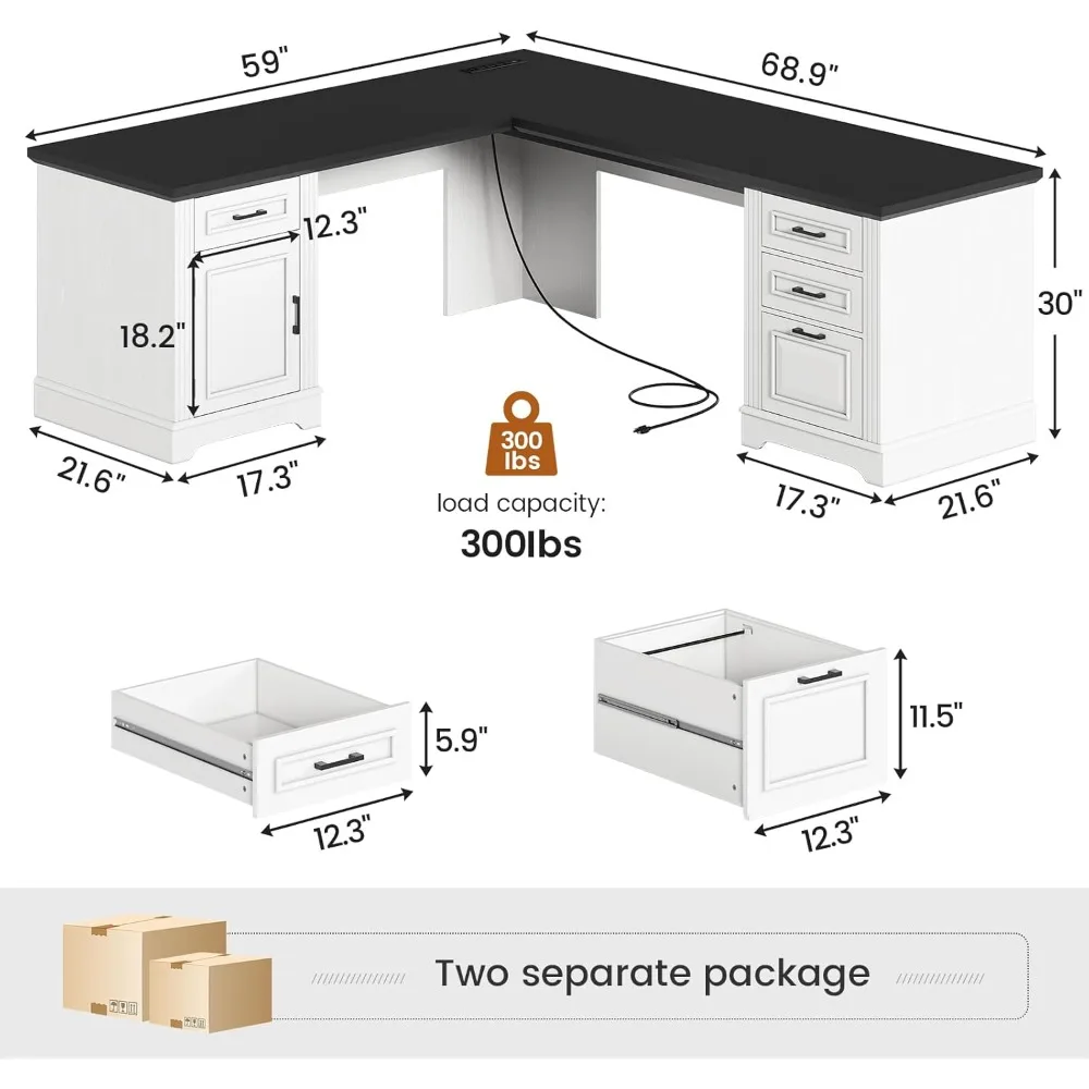 Farmhouse 69″ Executive L Shaped Desk, Home Office Desk with Drawers and Storage Cabinet & Power Outlet, Corner Computer Desk