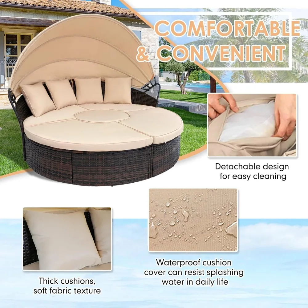 Outdoor Terrace Circular Sofa Bed with Retractable Canopy, Brown Wicker Furniture Combination Sofa with Washable Cushion