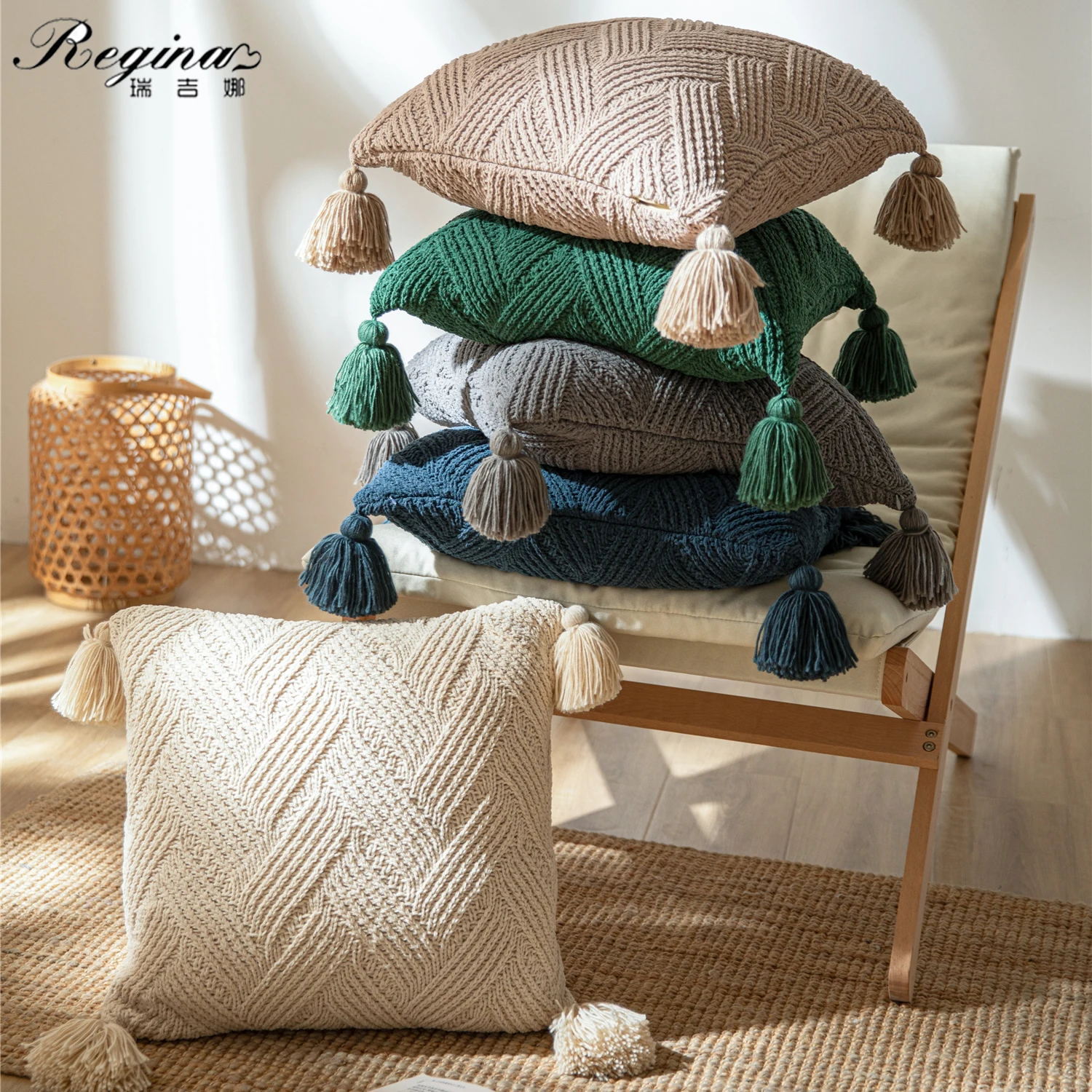 REGINA Pillow Cover Chenille Handmade Cute Tassel Sofa Cushion Cover 45*45 Solid Green Navy Beige Nordic Home Decor Pillow Case
