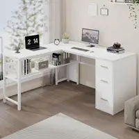 - L shaped desk Design:The 59.1″/55.1″ W x 19.7″/15.7″ D x 30.0″ H L-shaped desk offers versatile functionality, not only accommodating computers, monitors, and keyboards but also providing ample workspace for file organization, writing, drawing, and more. Additionally, this white L shape desk features three drawers: two medium-sized drawers ideal for storing office supplies and miscellaneous items, and one large drawer designed for file folders. Beneath the desk, there is an open shelf, perfect for conveniently accessing frequently used items. These storage options ensure efficient organization and management of office supplies.