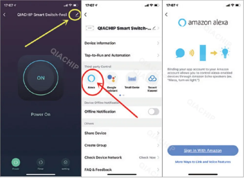 where you can change the name of the device, and you can see the details of the third-party controlled APP supported by the device, select the APP you need to connect, such as Alexa, click the icon to enter the binding interface, and then press The page prompts the operation.