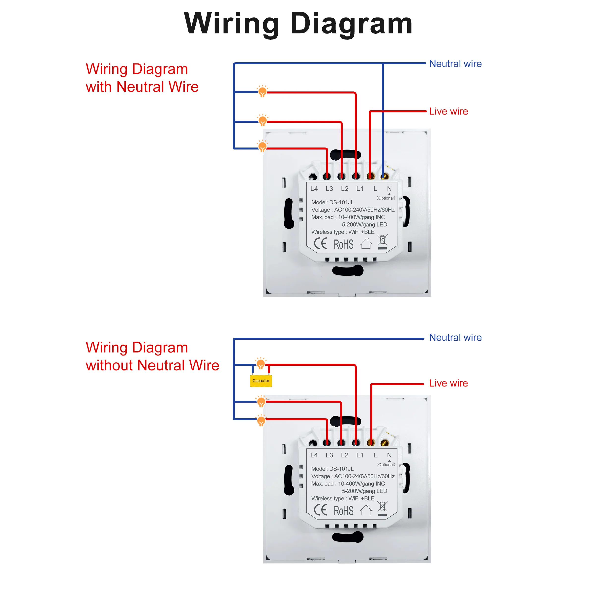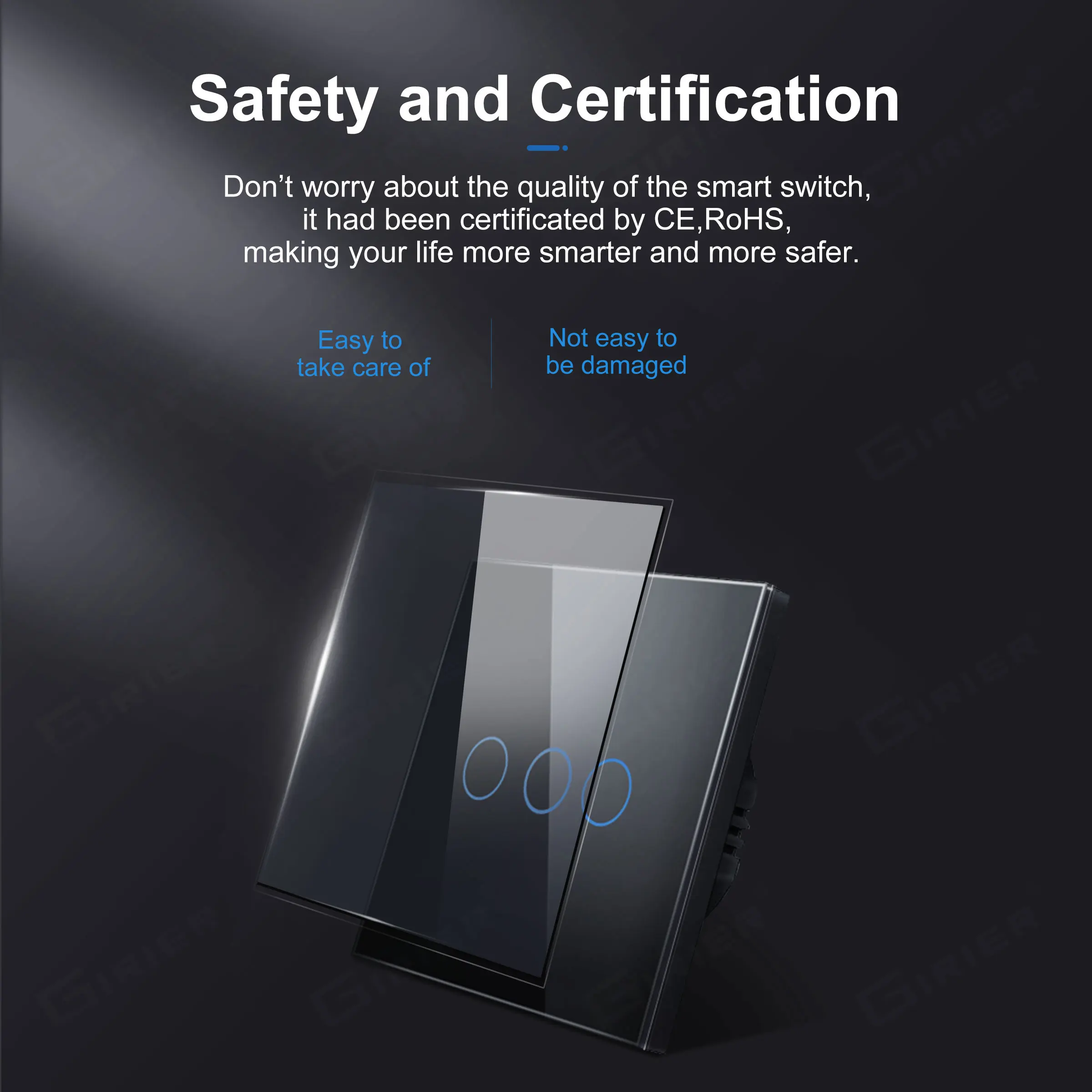 GIRIER EU wall touch switch made of toughened glass and flame-retardant PC. It doesn’t need neutral wire for installation, which allows you save a lot of time to install. The sturdy and durable toughened glass is very easy to clean that makes your life be worriless.
