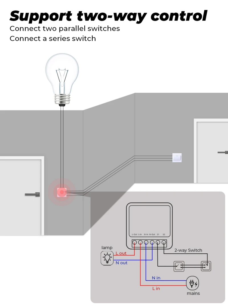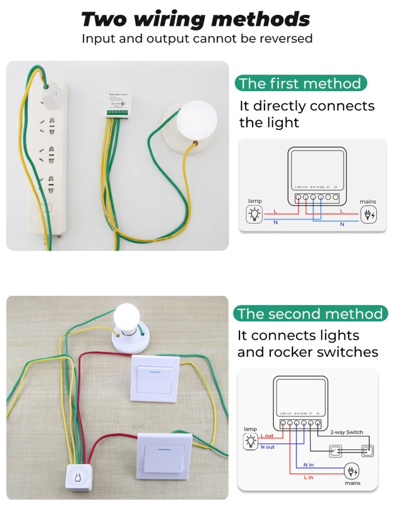 5.Support the rocker light switch to control devices (self-return switch not included). Support Two-way Control, This smart DIY switch could be used for your old 2 way control switch. Especially, you still available to control the old switch manually after isntalled it.