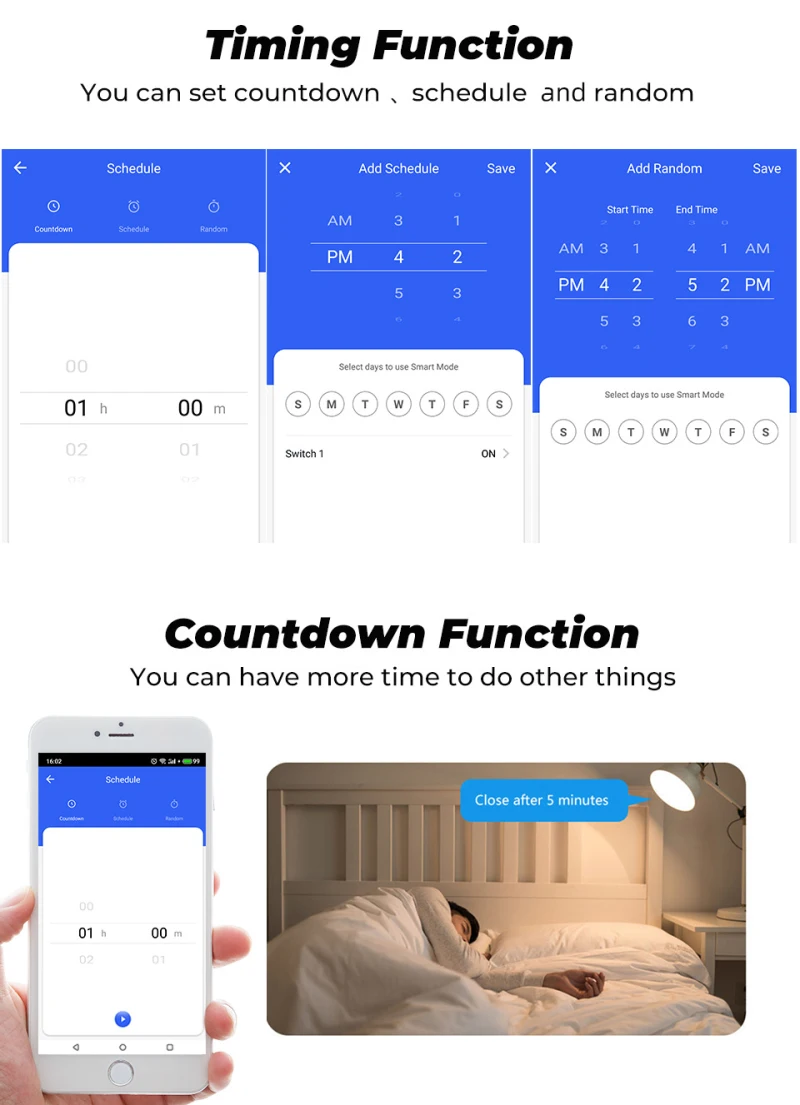4.Set a time for devices to make it start or stop running automatically. Create schedules to automatically turn the home appliances or lightings on/off. Helping you saving energy and electric fee.
