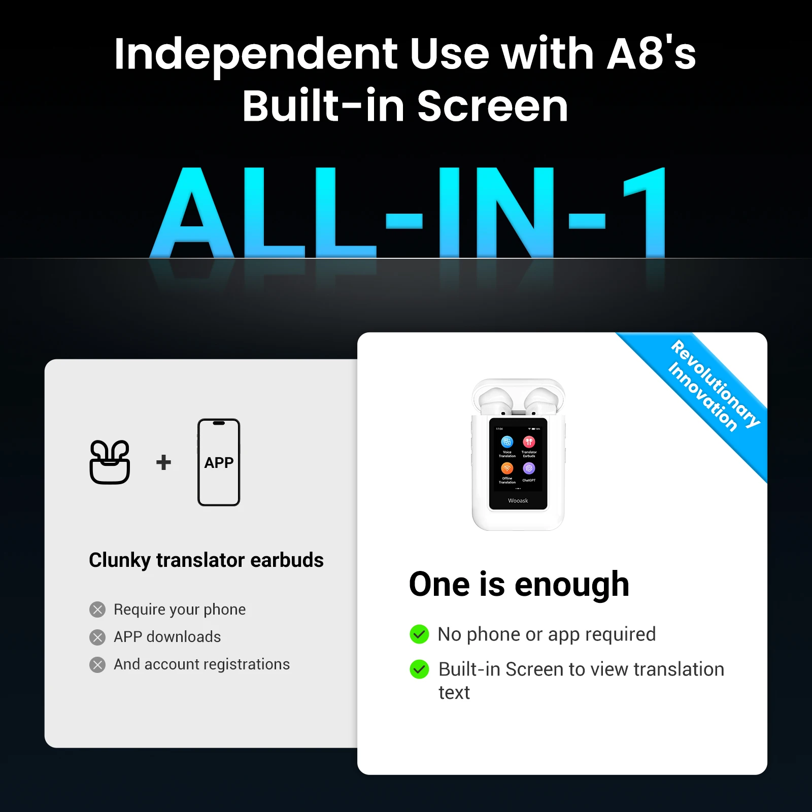 The A8 combines the advantages of a translation device and translation earbuds, offering online translation in 144 languages and 16 offline language packs. It’s innovative and convenient, breaking away from traditional translation methods.
